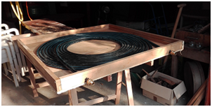 Mon 1er radiateur solaire a donc été fabriqué avec une couronne de 25m de tube polyéthylène dans un cadre en bois. Lors des tests en plein été, j’ai pu sortir de l’eau à plus de 60°.
